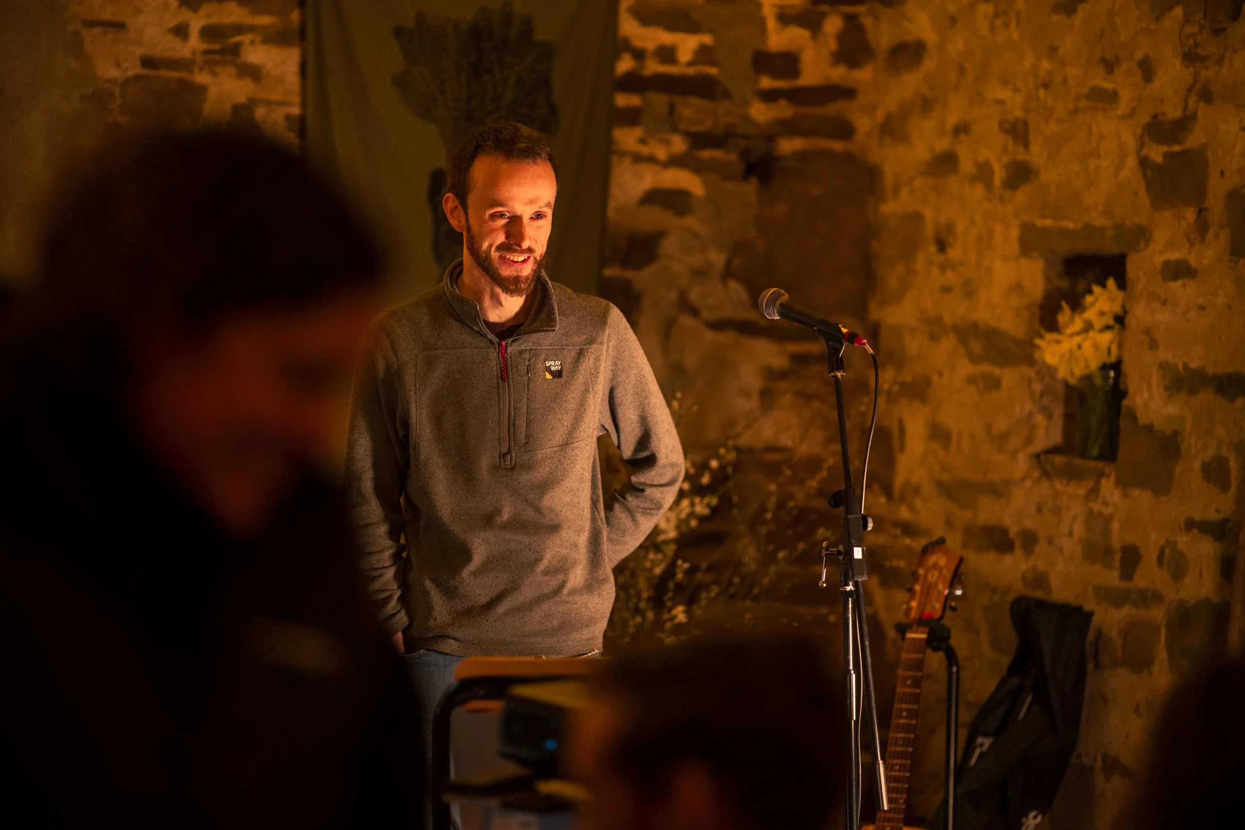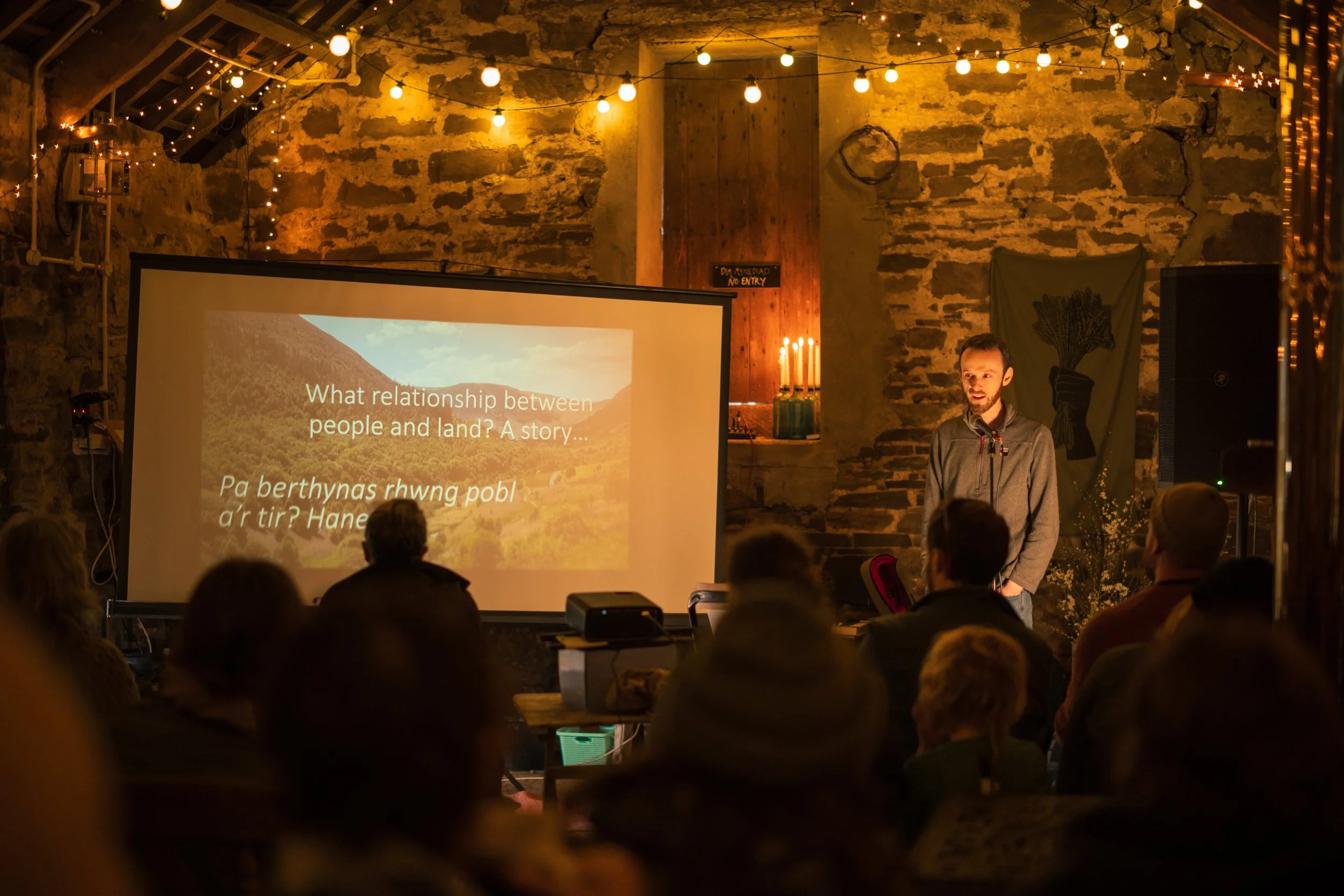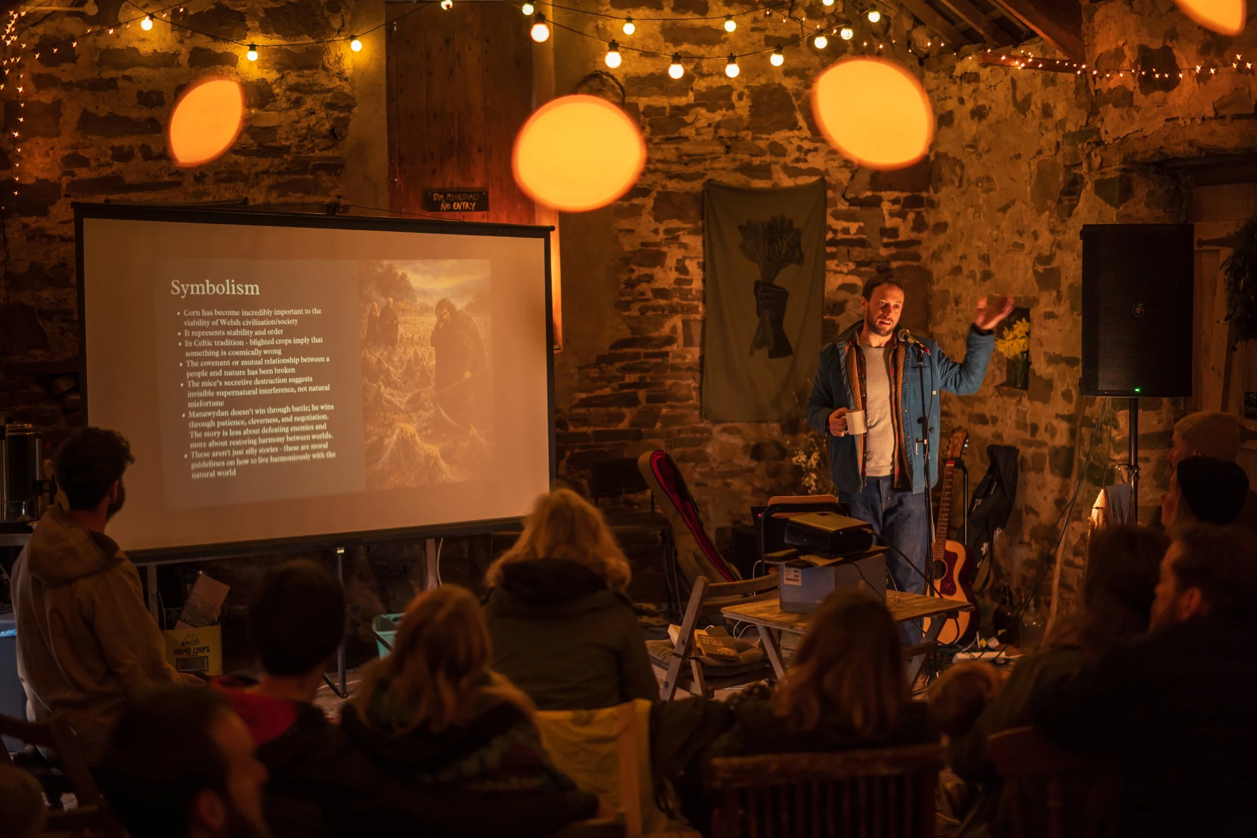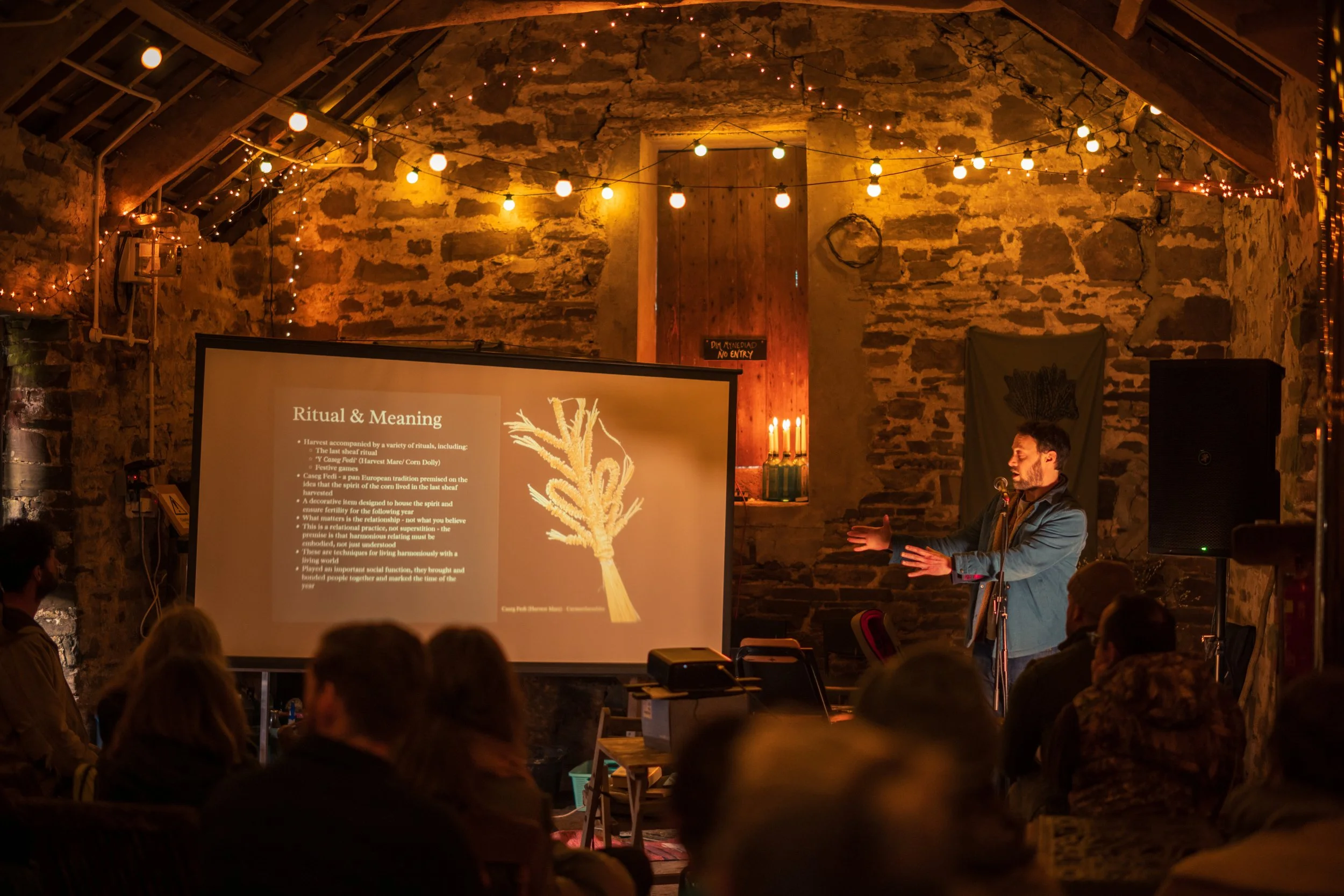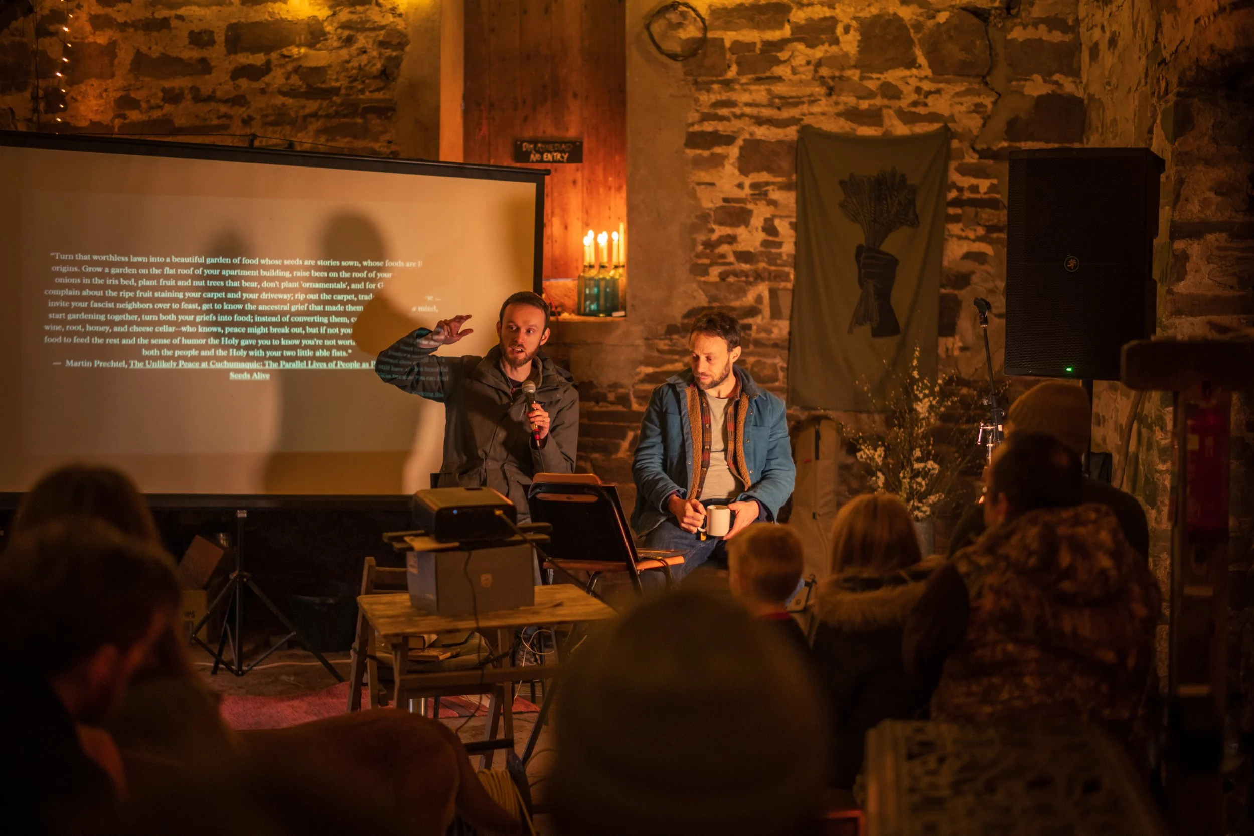 Our guests for the afternoon, author Carwyn Graves and musician and oat grower Owen Shiers, take questions from audience about how we can better connect with Welsh food, Welsh seeds and Welsh land, in front of a rousing call to action from Martín Prechtel (see below)…..