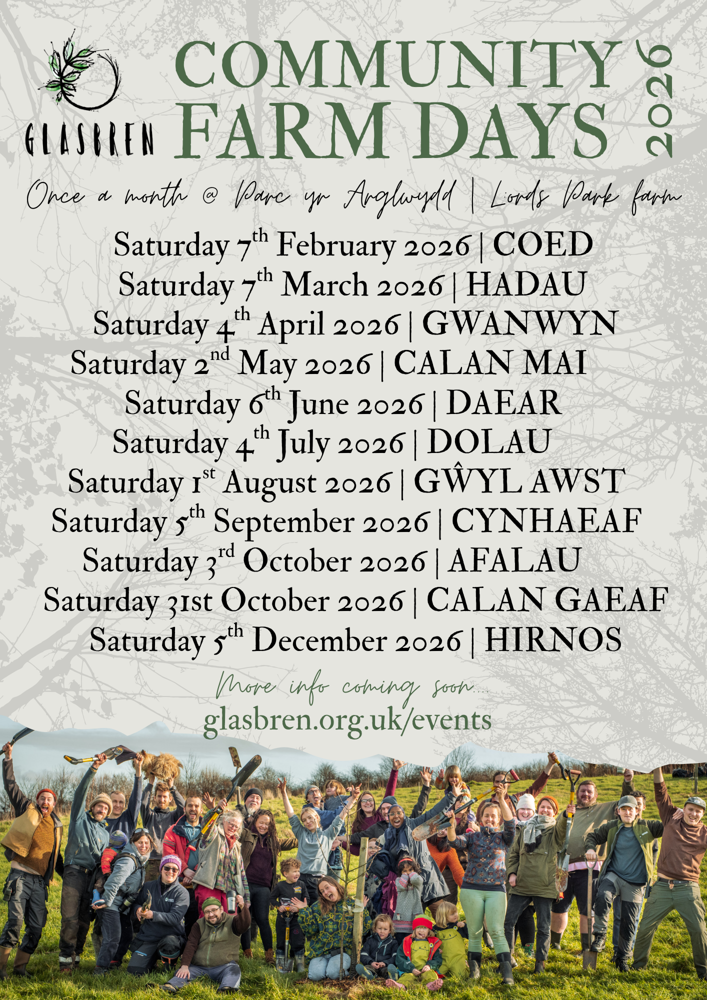 We’ve already released the dates for our 2026 Community Farm days. These really are the best way to experience Glasbren for the the first time. They are always well attended and bring together all ages for a helping hands session in the morning, a bring and share lunch, and then a free taster session or mini-workshop in the afternoon. They are themed around the season and what’s happening in the land or on the farm at that time of year. So in February, it’s be all about trees (COED), but come June, meadows will be the focus (DOLAU) and by October, it’s all about pressing apples (AFALAU)! Sign up free here.
