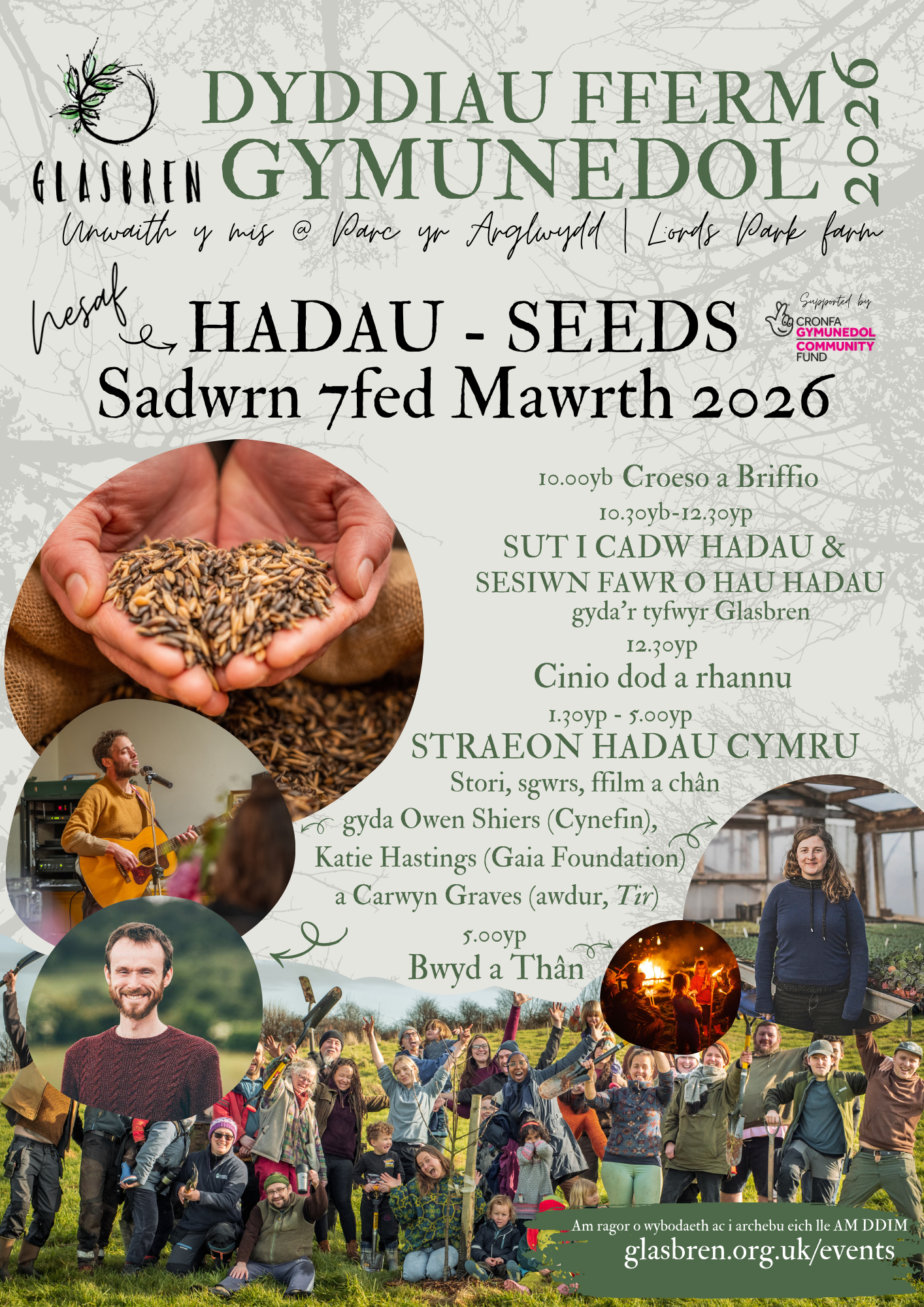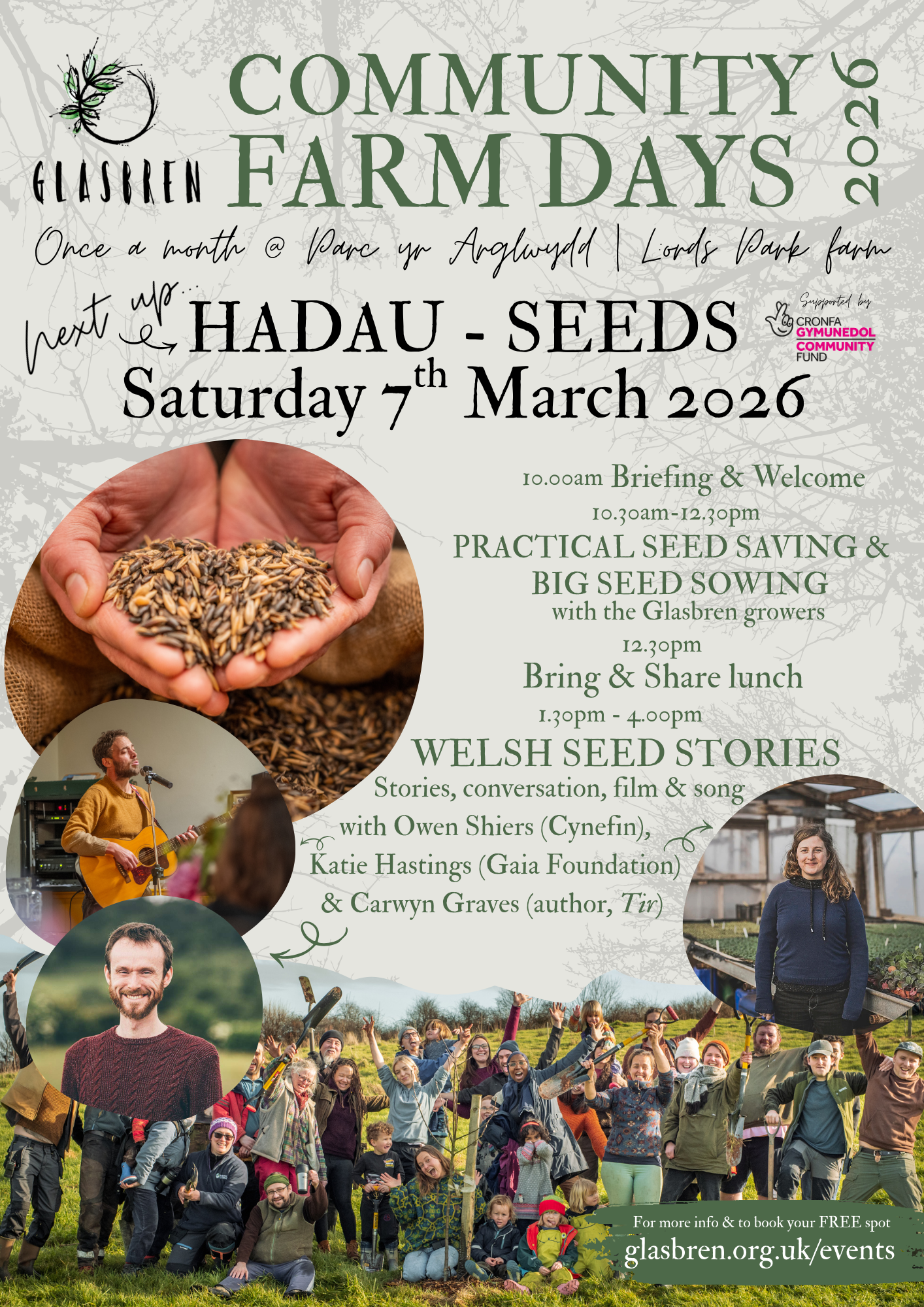 In March, our Community Farm day will be all about seeds! Help us kick off the 2026 growing season with a big seed sowing effort, and lots of seed related activities. This Community Farm day will also be a part of Carmarthen Seed Fortnight, a collaboration between Glasbren, SERO and the Incredible Seed Library, which includes Carmarthen’s annual festival of seeds, Seedy Saturday Carmarthen. In the morning, join the Glasbren growers for a seed sowing session, and to discuss practical seed saving, seed breeding and seed sovereignty while handling and planting seeds.