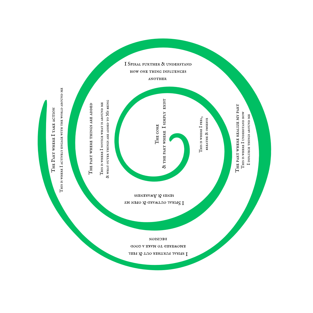 1. Start from the centre of the spiral. The spiral reminds us to start in the middle, with you. Take a deep breath, feel your feet on the ground, and notice how you feel. 2. Move from authenticity and intuition Inside you is a quiet feeling, a little voice in your heart or tummy — that helps you know what feels right or not. 3. Respect the lives of future generations