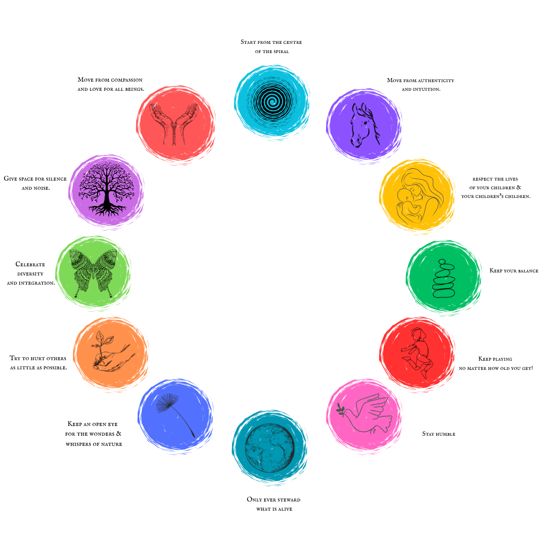 The Earth and all living beings belong to life itself. When something is placed in our care, we ask: How can I look after you best? 8. Listen to the whispers and wonders of nature When we pay attention, we learn to appreciate and care for the world more deeply. 9. Try to cause as little harm as possible It is impossible to cause no harm at all, but we can always try to reduce it. 10. Celebrate diversity and integration Just like a healthy forest, our communities are stronger and richer when they are as colourful as possible.